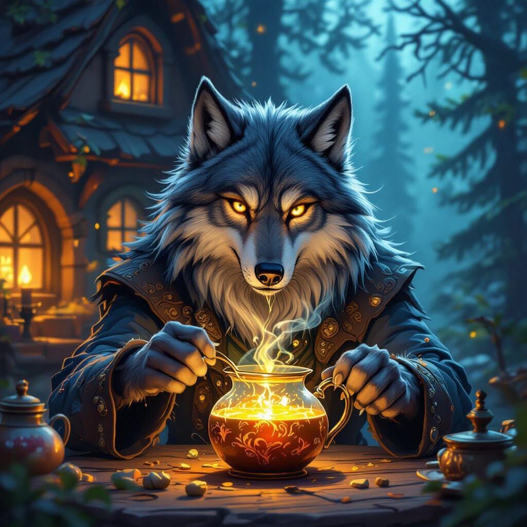 Oil on canvas. Medium shot. A whimsical wolf shifter in a cozy cottage interior, stirring a bubbling potion in an ornate teapot. Detailed fur texture, glowing eyes. Fantasy concept art. Enchanting forest background. Soft, warm lighting. 8k, masterpiece, trending on artstation, intricate details, vibrant ...