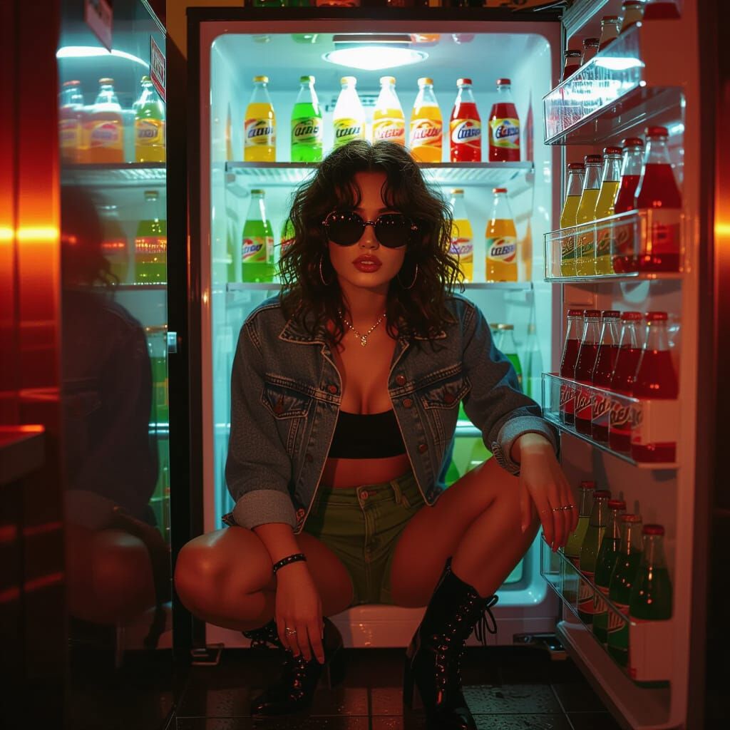 This image shows a woman in a denim jacket and sunglasses crouching before a refrigerator. The photograph uses a fisheye lens, bold flash lighting and cinematic style to create a striking portrait.