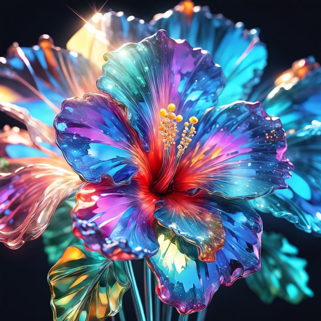 This image showcases a hyperrealistic digital art bouquet of aqua green crystal hibiscus flowers. Their translucent petals refract light, creating a vibrant, dreamlike display with subtle luminescence.