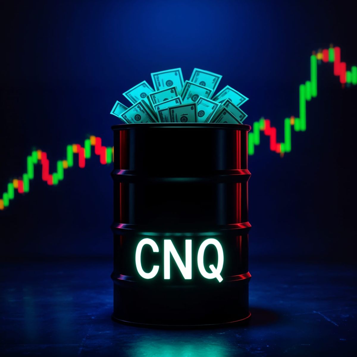 This image shows a black oil barrel overflowing with US dollar bills against a financial chart background. The scene is in a synthwave aesthetic with neon lighting and a blue gradient.