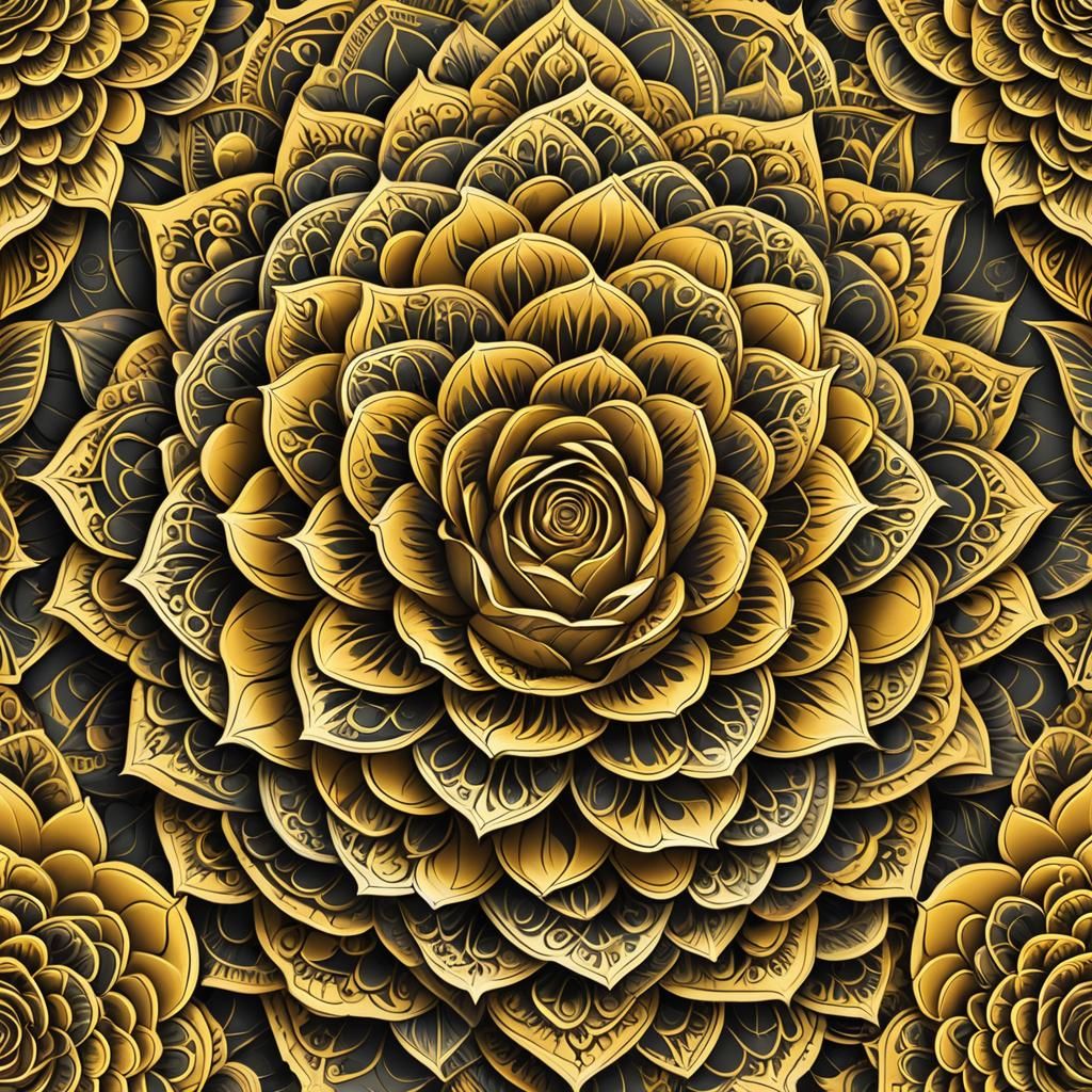 This image depicts a yellow rose mandala with abstract vector fractal elements. The design incorporates Zentangle patterns and 3D shading for a complex, visually engaging effect.