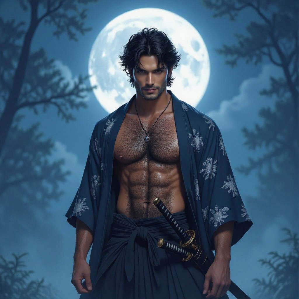 A striking picture of a muscular, shirtless man with dark hair standing in a moonlit forest. He has a katana on his back and wears a patterned haori. Mist swirls around his feet.
