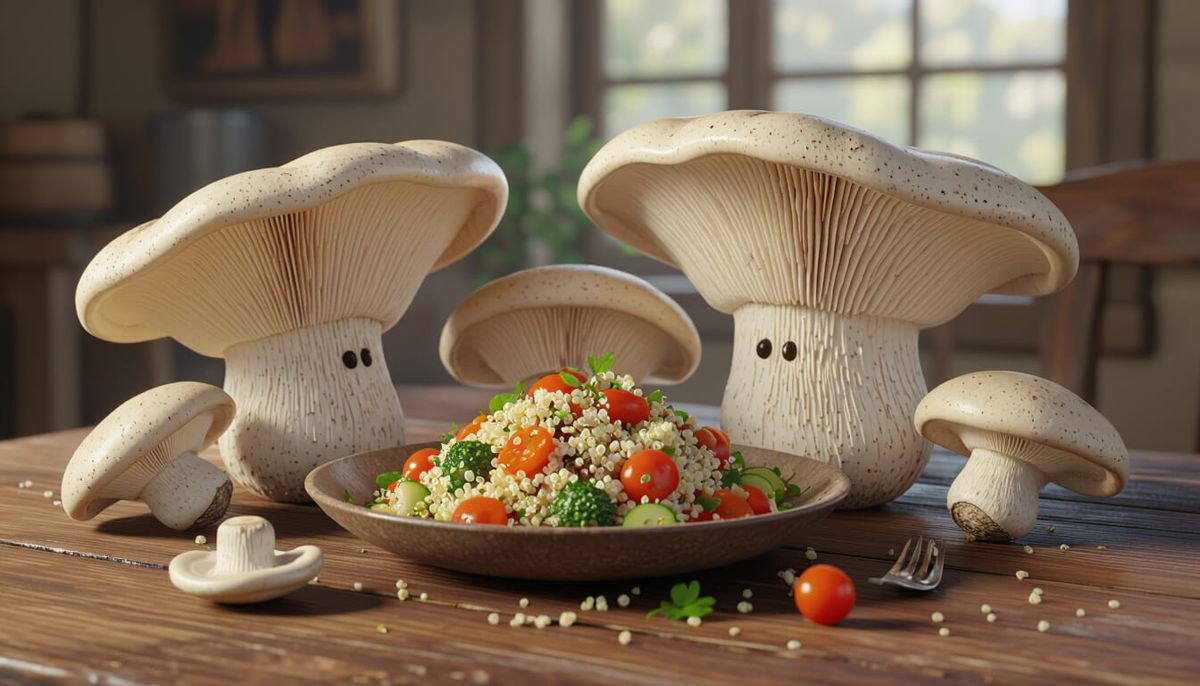 This image shows whimsical oyster mushrooms enjoying a vibrant quinoa salad at a rustic wooden table. The scene is rendered with realism reminiscent of fantastical digital art.