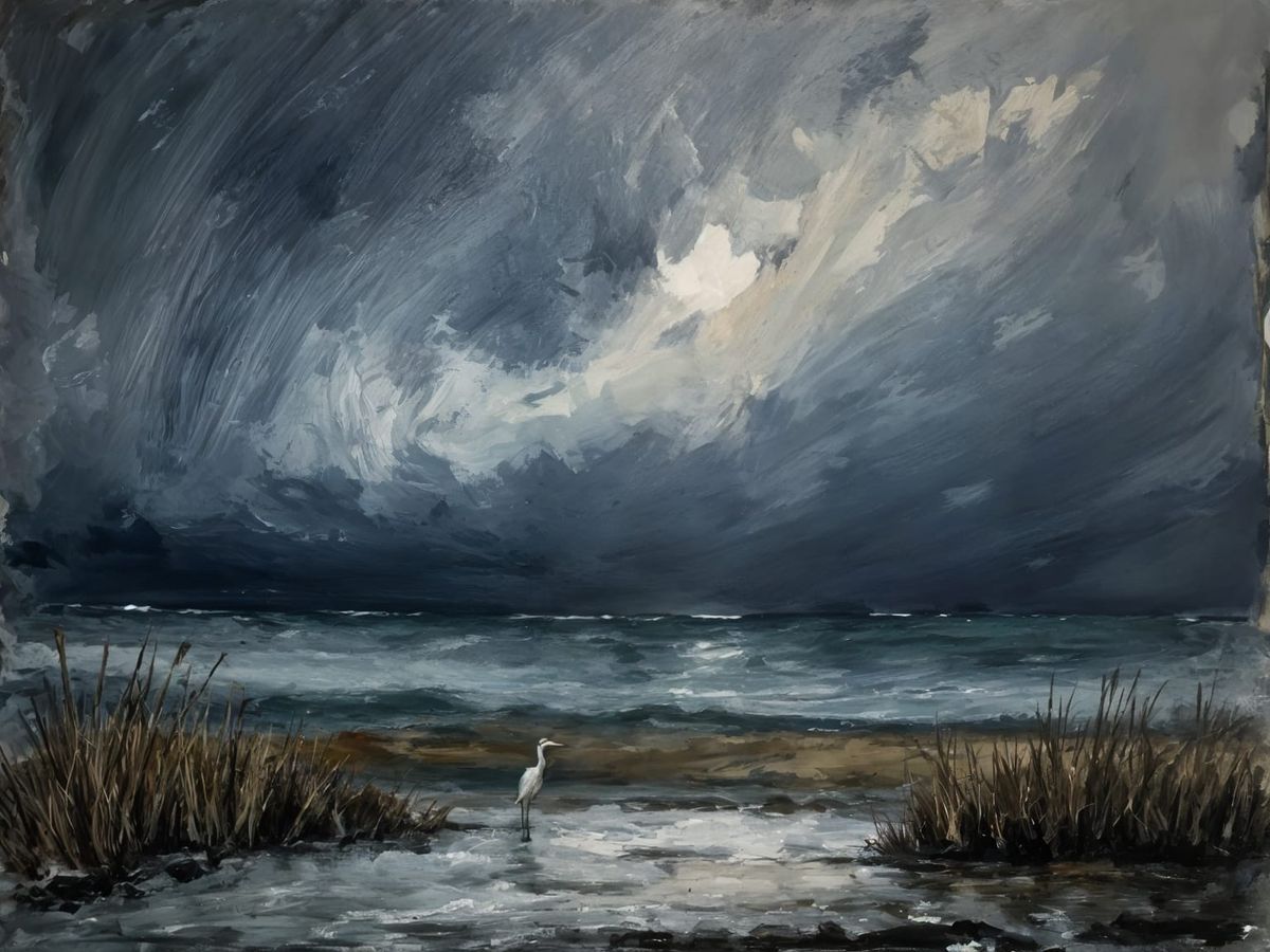 A dramatic image of a storm approaching from the sea, viewed from a salt marsh where a solitary heron stands. The artwork has an abstract landscape aesthetic.