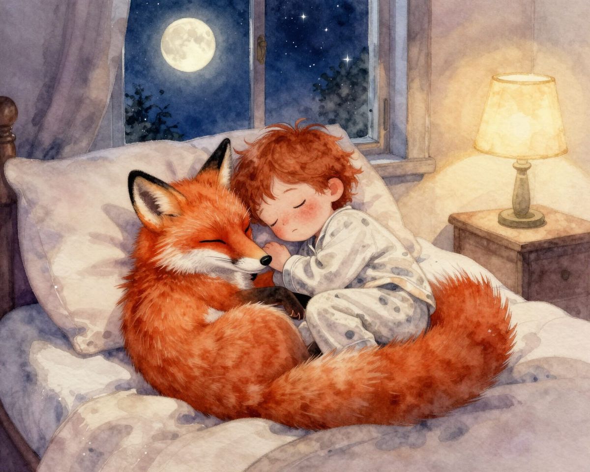 This image shows a fluffy fox and a child with freckles sleeping soundly together on a cozy bed. Gentle golden and moonlight create a warm, peaceful atmosphere in watercolor style.