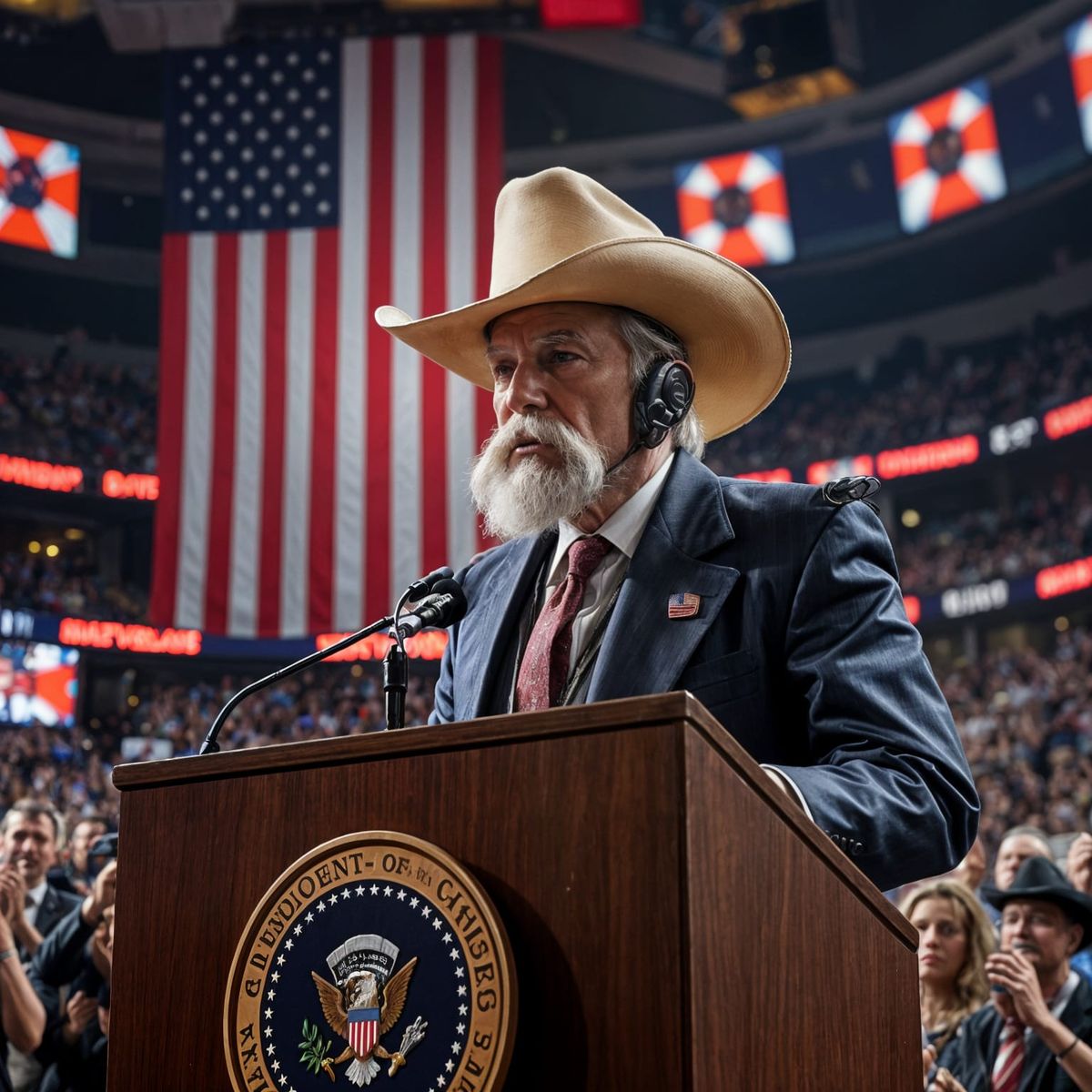 This image depicts a cyborg President of the United States addressing a crowd at Madison Square Garden. The president has white mustaches, a cowboy hat, and stands before an American flag.
