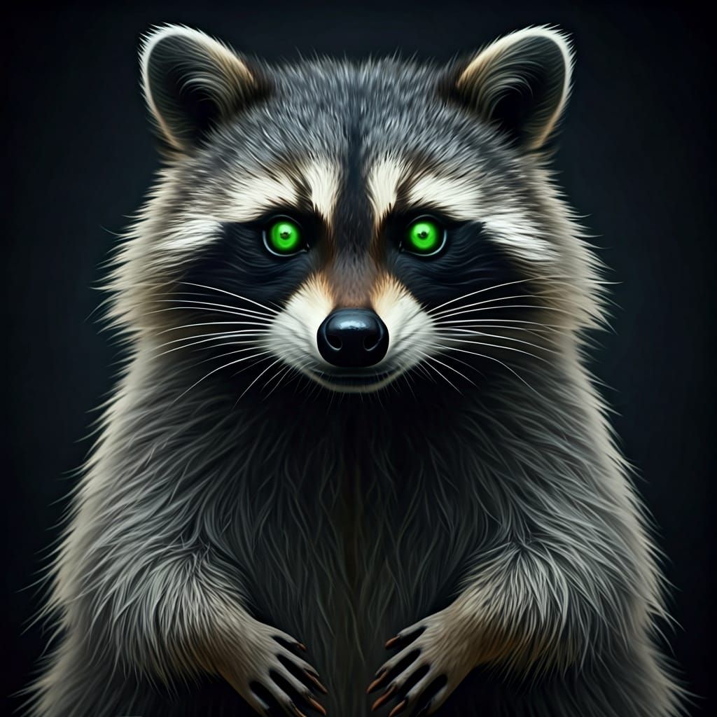 This image shows a mischievous raccoon with a sleek gray and black coat, and striking neon green glowing eyes. The raccoon's light brown paws stand out against its dark fur as it scavenges.