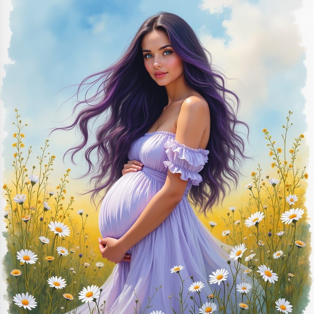 This image depicts a pregnant woman with long, dark hair and turquoise eyes, wearing a flowing dress in a field of daisies. Created in a gouache and watercolor style with thick, textured brush strokes.