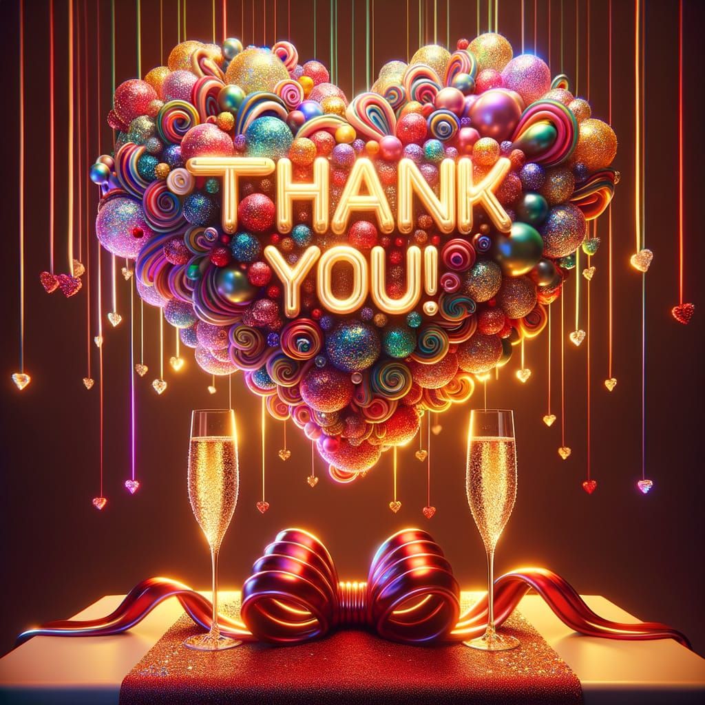 This image shows a joyful scene of balloons in 3D forming the phrase 'Thank you!' amidst a warm and welcoming environment, complete with champagne flutes and a heart-shaped ribbon.