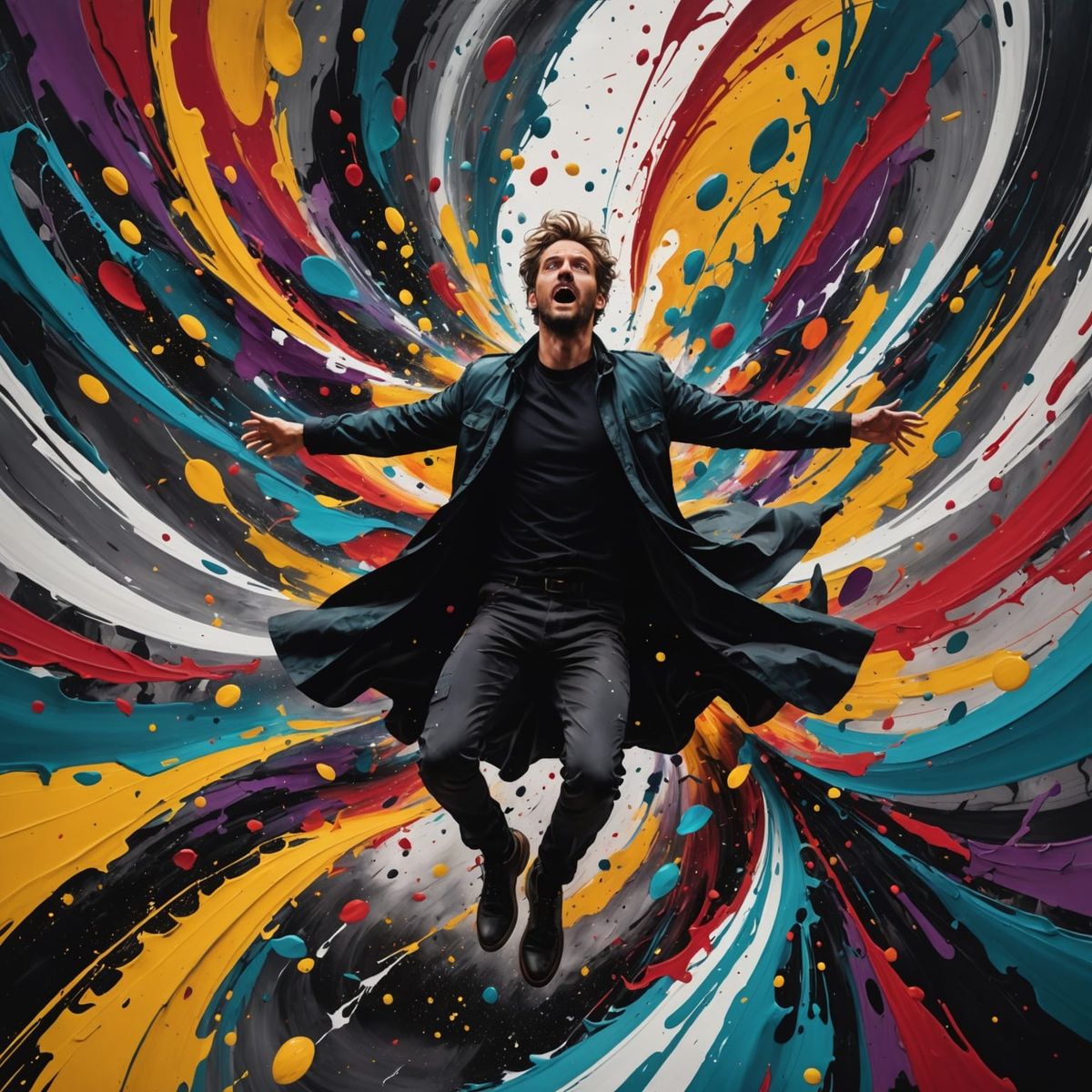 A dynamic image of a figure falling through a vortex of swirling colors and shapes. The background features chaotic abstract forms in an ethereal splash art style with triadic colors.