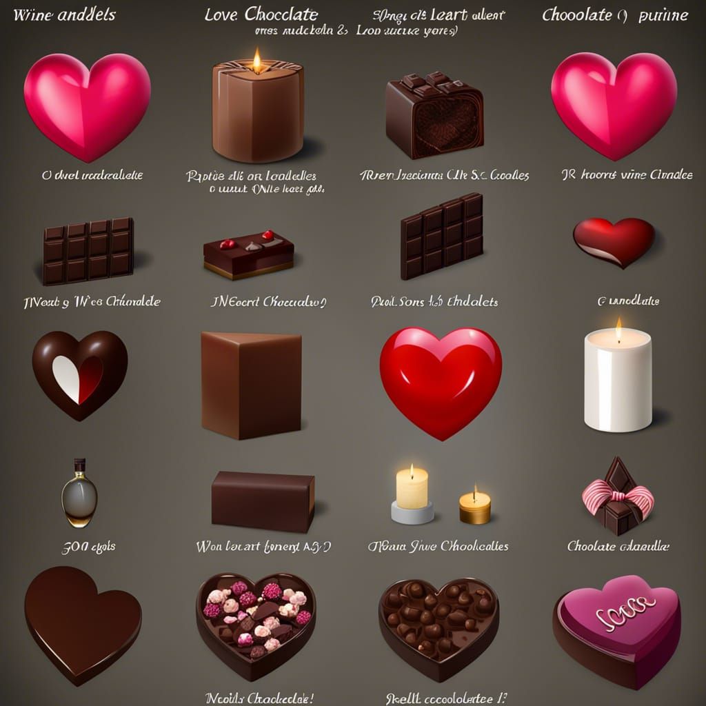 This image shows a bulleted list titled 'LOVE' featuring a heart, chocolate, wine, and candles. The image presents the ingredients for love as a simple list.