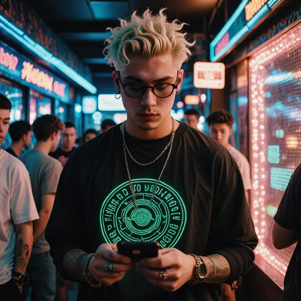 A handsome young man with a trendy outfit and tribal tattoos, standing in a discotheque surrounded by neon lights and glow-in-the-dark sparkles, looking at his phone with a curious expression.