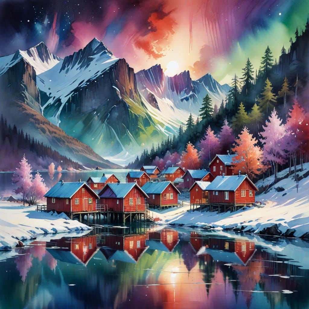 A picturesque Norwegian village nestled under the vibrant aurora borealis. The image showcases stilted wooden cabins reflected in the icy fjord, with snow-capped mountains in the background. Impressionistic style, reminiscent of watercolor art, creates a serene and magical atmosphere.