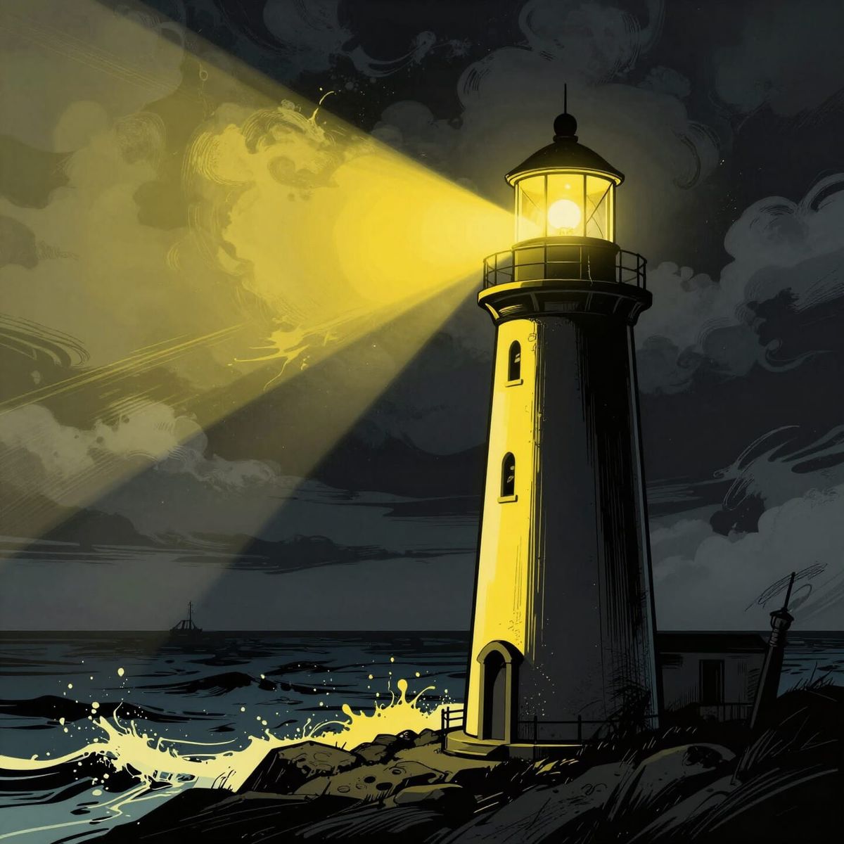 This image depicts a minimalist lighthouse with a striking yellow beacon cutting through a stormy sea and dark clouds. Rendered in a bold graphic illustration style.