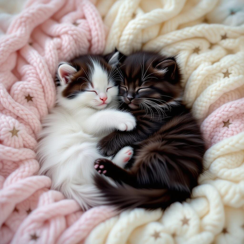 A captivating photograph of two fluffy kittens, one black and one white, curled together in a yin-yang pose. They sleep peacefully on a soft blanket with stars and moons, rendered with hyperrealistic detail.