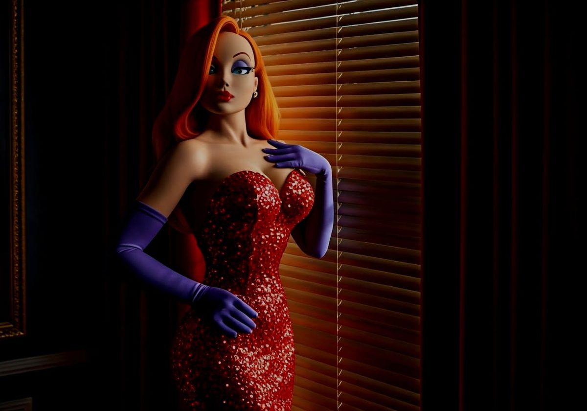 This image shows Jessica Rabbit standing by a window, her figure silhouetted against a warm glow of light filtering through blinds.