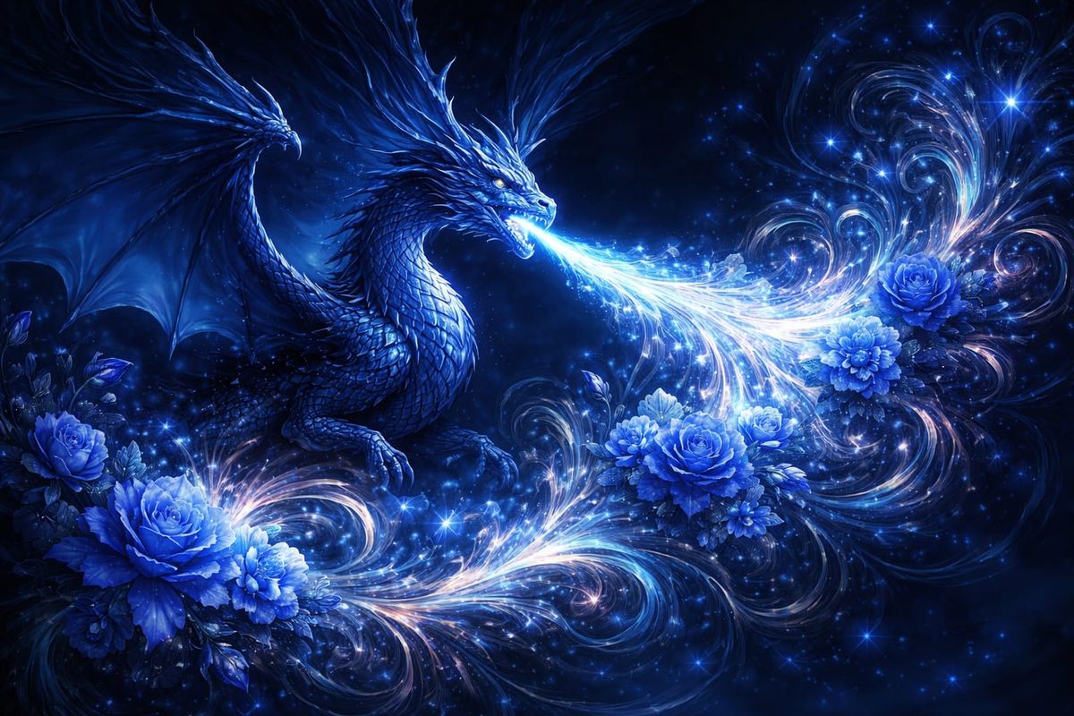 A surreal 3D render of a majestic sapphire dragon breathing fire that transforms into blue flowers, bathed in an ethereal glow with cinematic volumetric lighting.