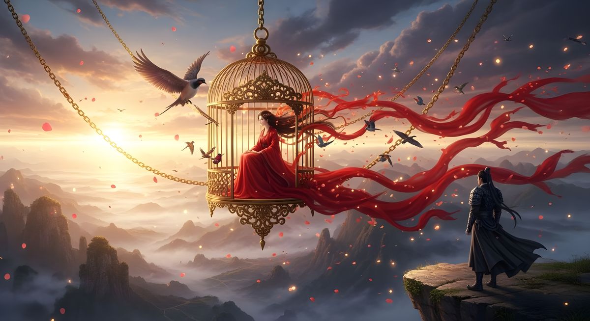 A surreal fantasy scene featuring a woman in a golden birdcage over a misty, crimson valley at dawn. Inspired by Chinese mythology and cinematic art.