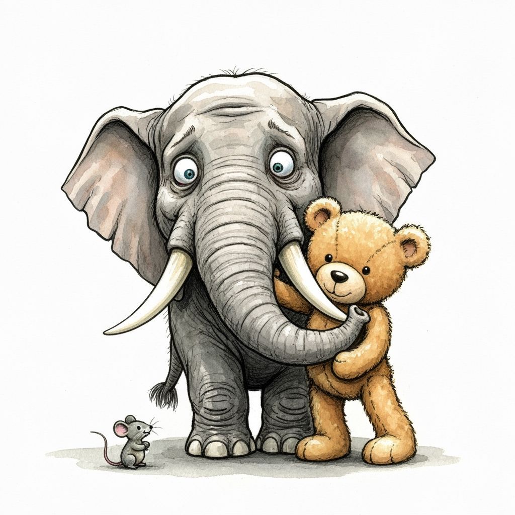 This detailed watercolor and ink illustration depicts a wide-eyed elephant startled by a tiny mouse, finding comfort in a gentle hug from a teddy bear.