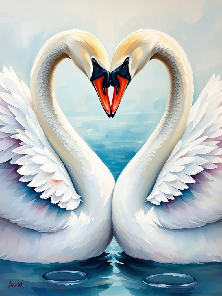This image shows two swans forming a heart shape. The artwork blends watercolor and neo-mosaic elements with heavy impasto brushstrokes and light infusion to create an elegant, emotive scene.