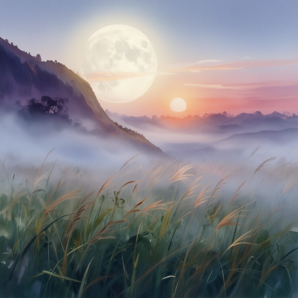 This image shows mystic watercolor hills shrouded in fog, illuminated by a full moon. Fields of wheat glow with great colors at dusk, creating an evening fantasy air.