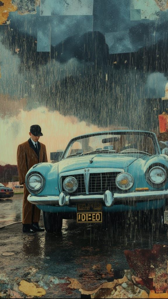 A surreal collage of a man in a suit standing next to a blue car during a rainstorm. The image has a glitch art aesthetic and evokes dreamlike color fields.