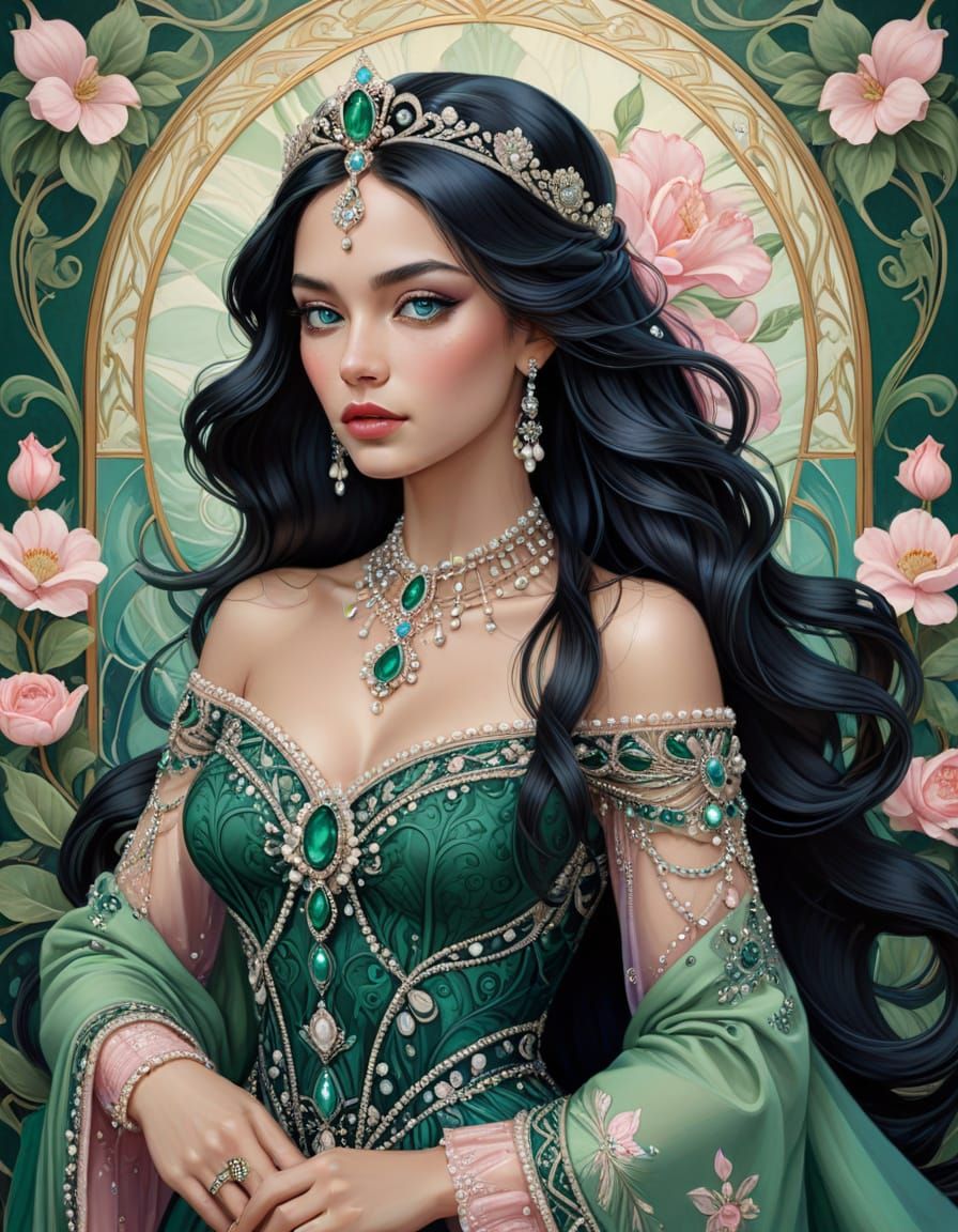 A digital painting shows an elegant queen with black hair and blue eyes wearing a pearl and emerald dress. The artwork features ornamental details in an Art Nouveau style.