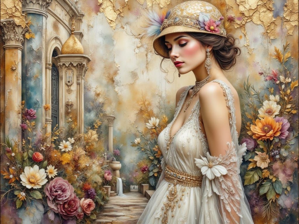 This image showcases a full-body portrait of a woman in a feathered cloche hat and beaded dress, set against a backdrop of manor house and Art Deco architecture, rendered in a surreal, mixed-media collage style with metallic and glittery accents.