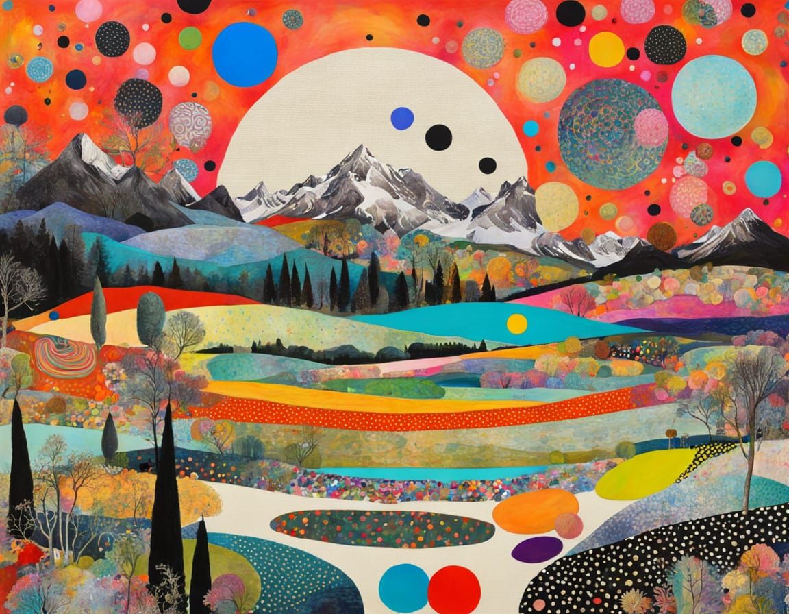 A vibrant mixed media landscape artwork featuring dots and circles, created with acrylic phototransfer, textile, and enamel on linen, evoking a surrealist feel with saturated pastel colors.