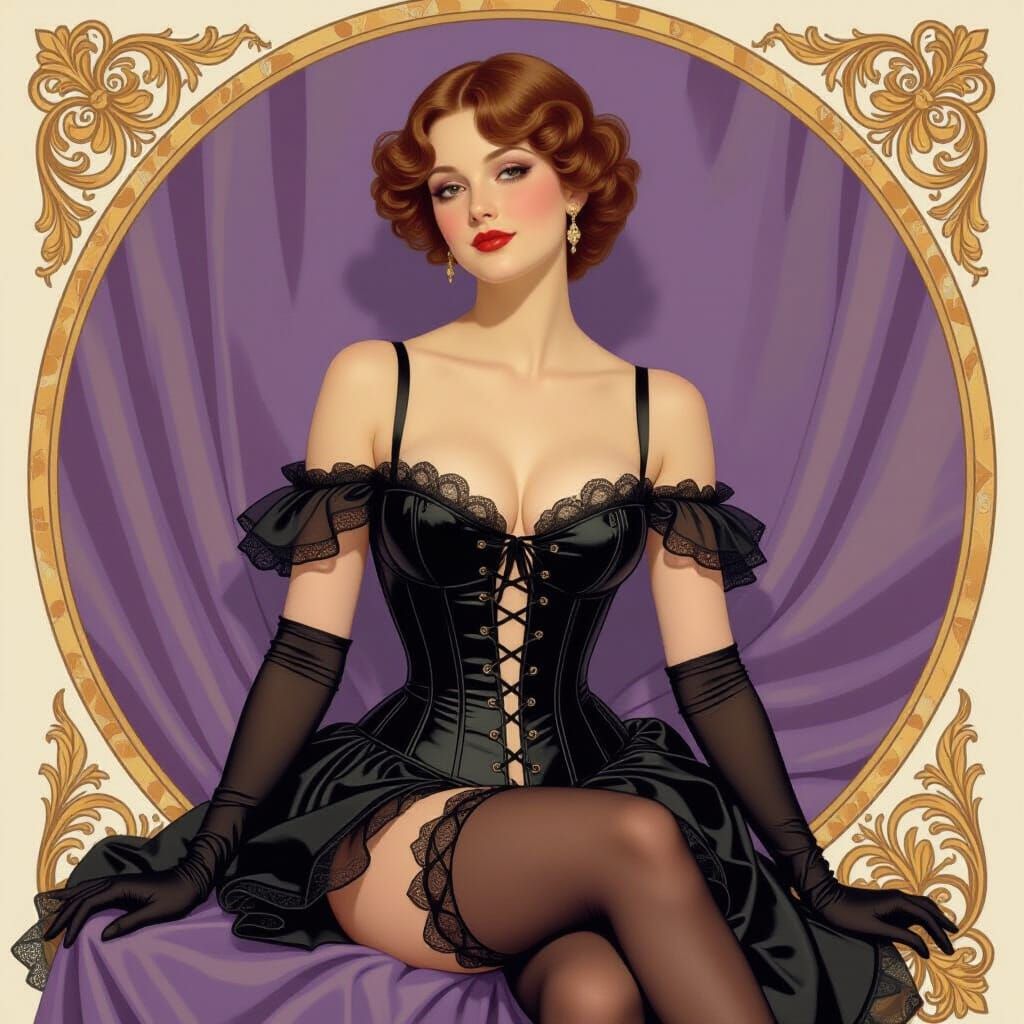 A sophisticated woman sits gracefully in a black corset and stockings. The artwork evokes art nouveau and impressionist paintings with its soft colors and delicate details.