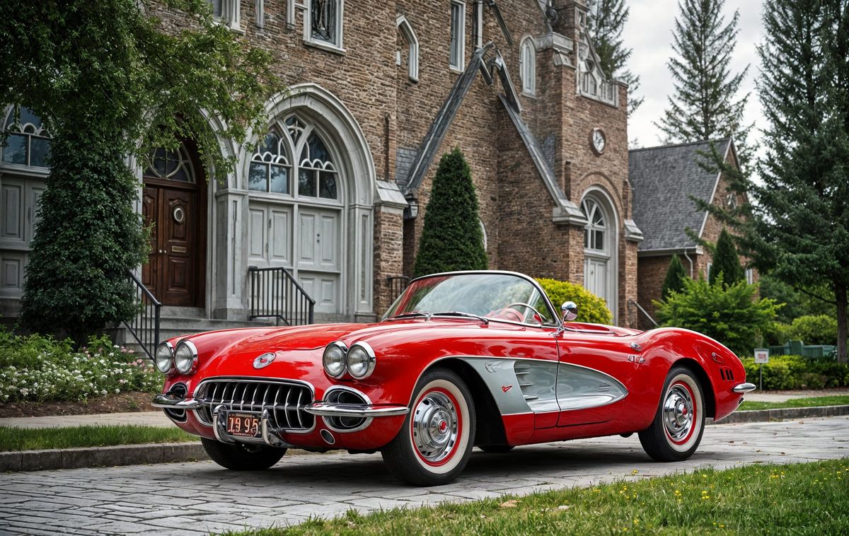 This image depicts a classic 1958 cherry red Corvette parked in front of St. Peters Catholic Church in Worcester, Massachusetts. The car is a four-light style model.