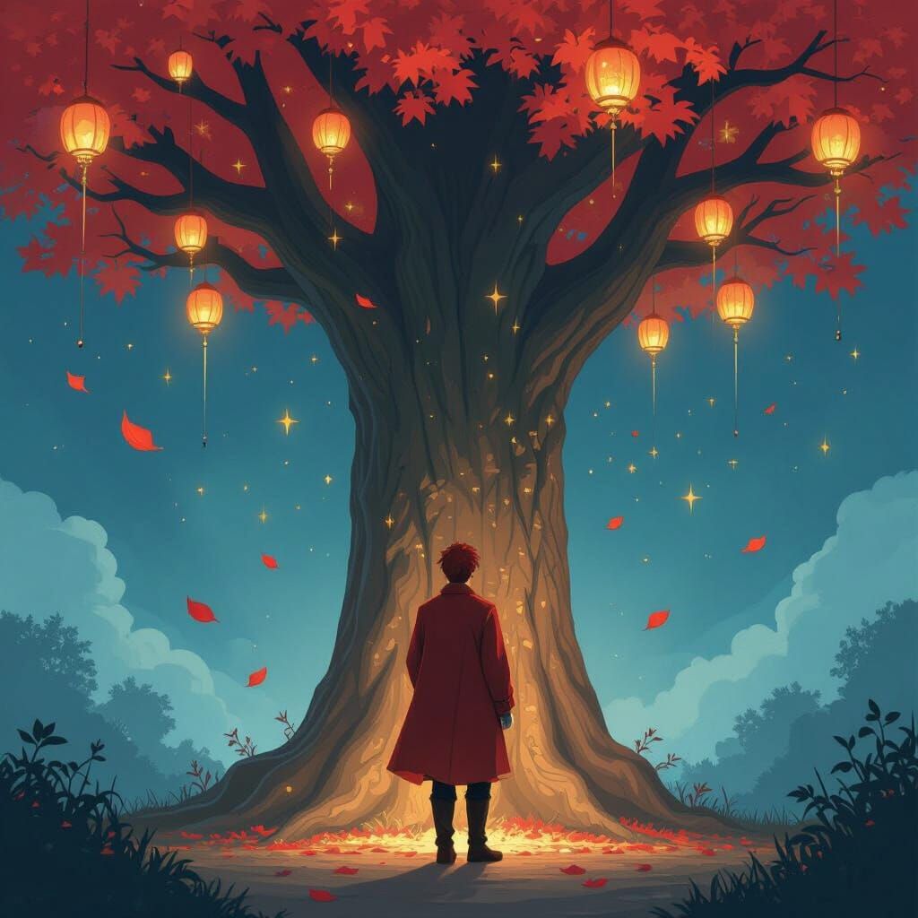 A striking picture of a red-haired man in a brown coat, standing thoughtfully beneath a giant white tree. The tree's branches form a magical canopy reaching toward a starry night sky. The artwork is in a semi-realistic digital illustration style.