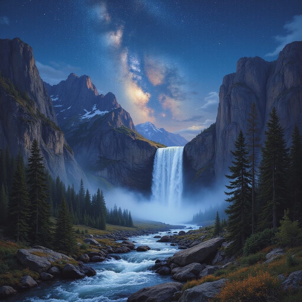 This image shows a breathtaking waterfall at night, surrounded by towering mountain peaks and a brilliant starry sky, painted in a heroic oil style with deep, rich colors.