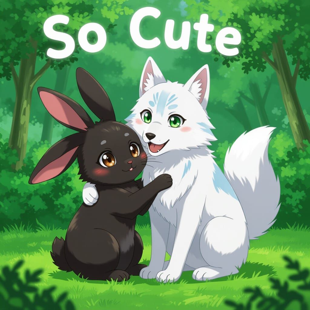 This anime image shows a happy white wolf with green eyes holding a black rabbit with brown eyes as they spin together, with "So Cute" text above.