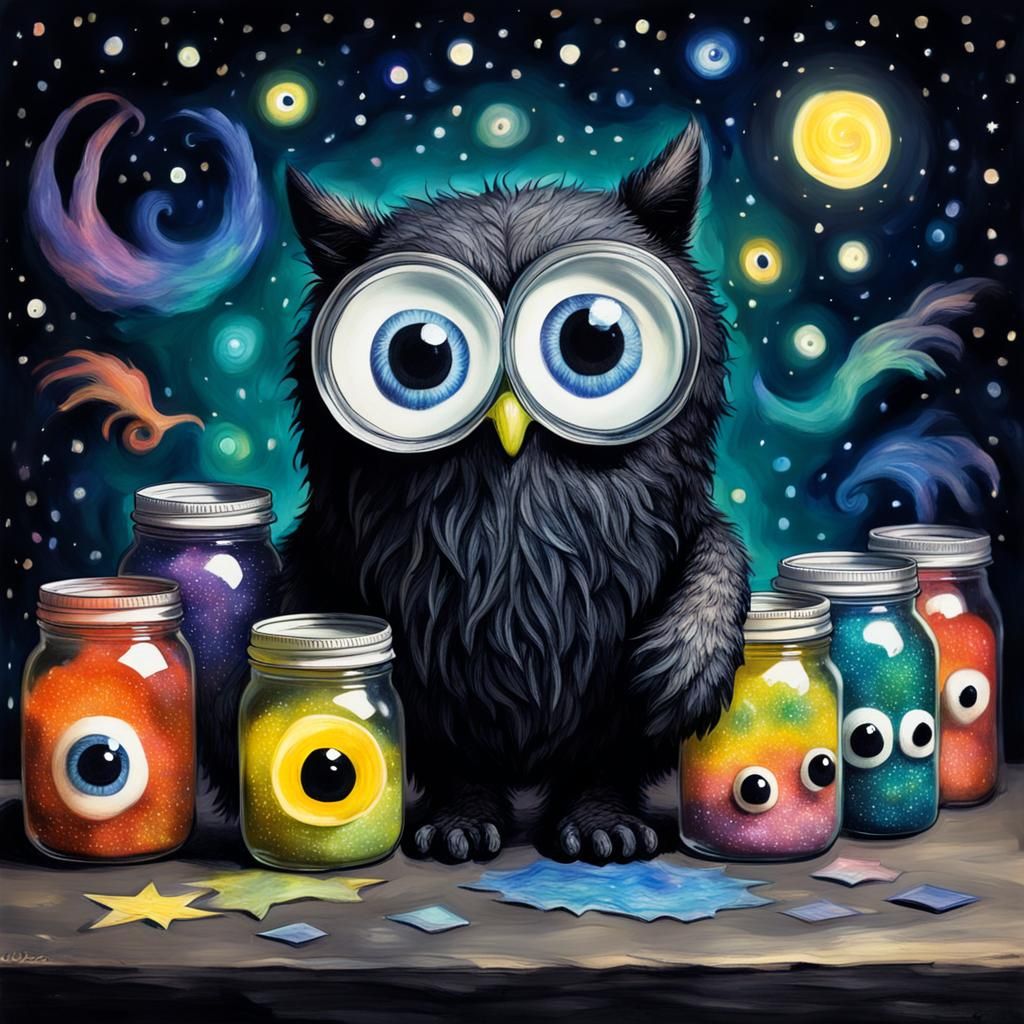 This image shows a gothic creature with googly eyes holding jars filled with more googly eyes. The artwork is reminiscent of Van Gogh's Starry Night, rendered as a crayon drawing.