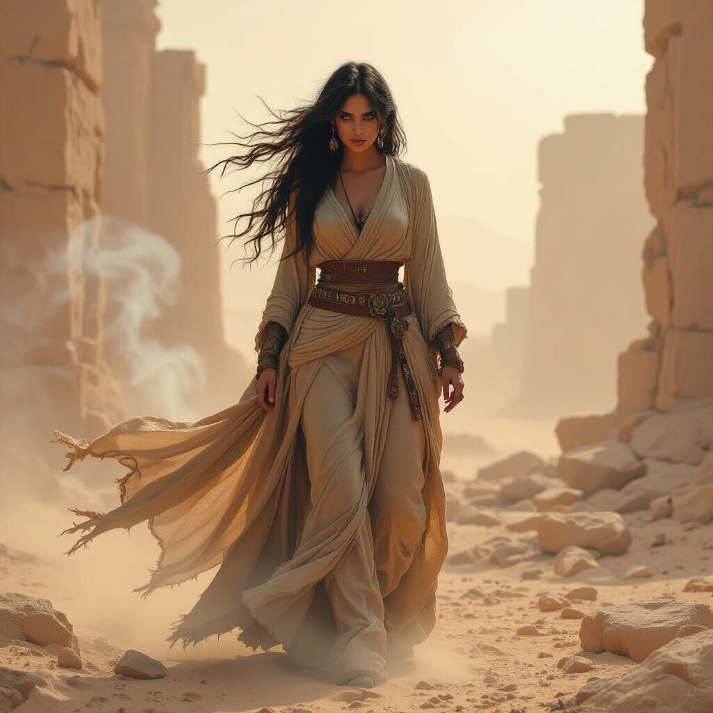 A captivating image of a female djinn standing amid desert ruins, wind whipping through her robes and hair. Pale smoke swirls around her as her fiery gaze burns intensely. Evokes a blend of mystical and elemental forces.