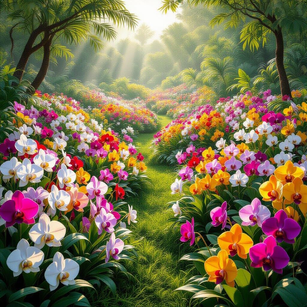 This image shows a sprawling field of diverse orchid species in full bloom, rendered in a hyperrealistic digital painting style with luminous, saturated colors and exquisite detail.