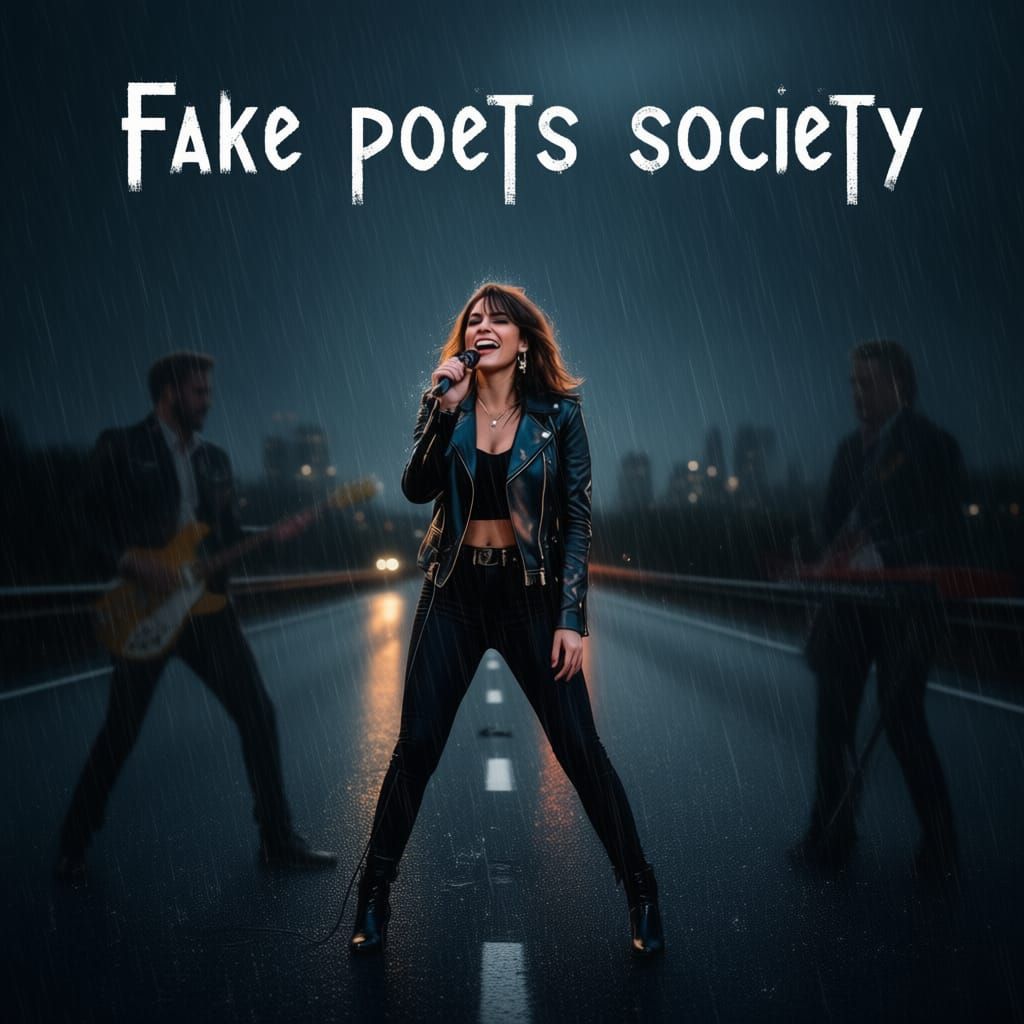 A striking image of a goddess with a fierce smile on a dark, rainy highway at night. The words 'Fake Poets Society' are visible in the background.