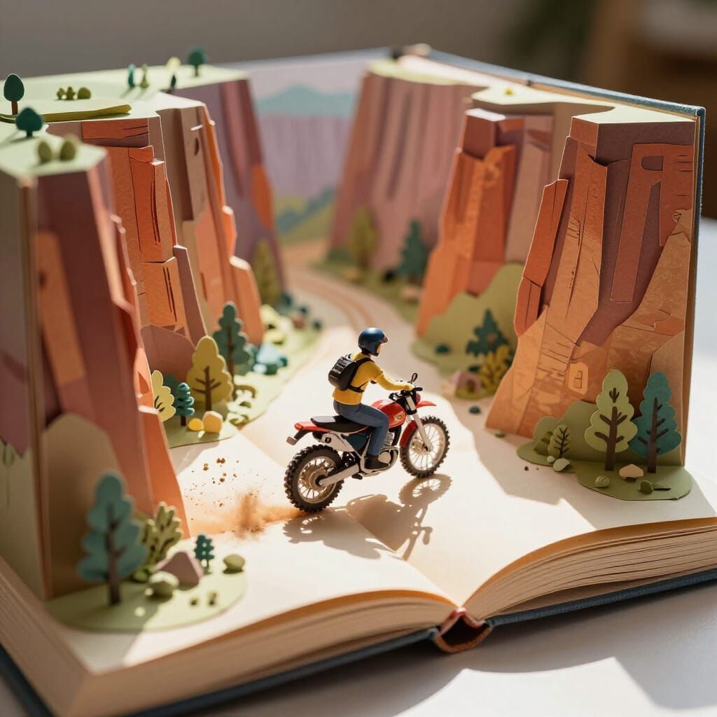 Easily design unique popup book style images of motorcycle riders in canyons with our free AI generator.