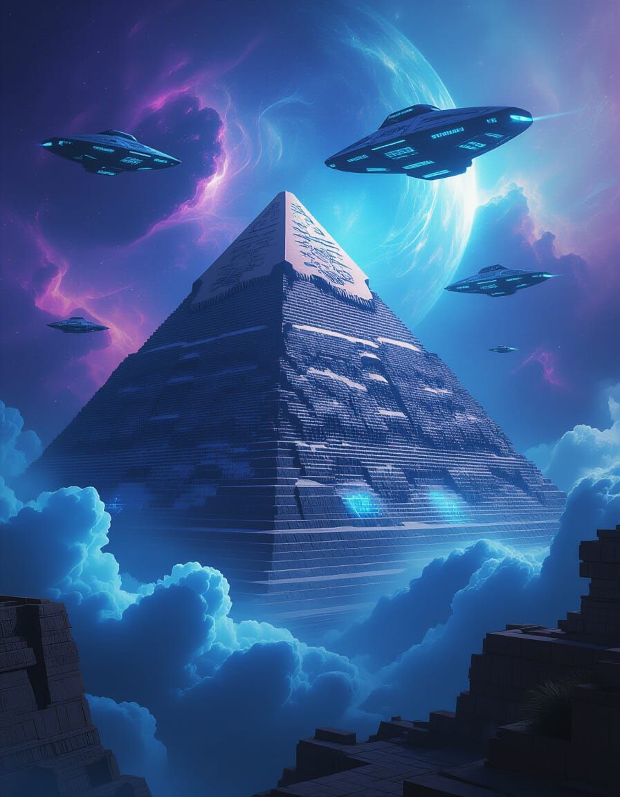 This image shows a massive, ancient pyramid emerging from a vibrant, swirling nebula. Alien spacecraft with complex designs float nearby, illuminated by bioluminescent plants and cosmic light.
