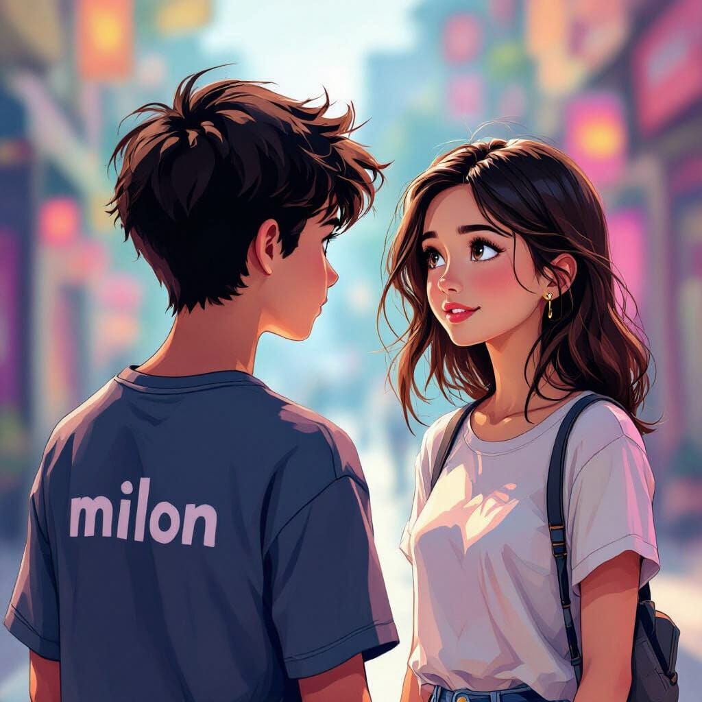 This image shows a boy admiring a beautiful girl. The boy is wearing a t-shirt with the name 'milon' on the back. The artwork is rendered as vibrant digital art.