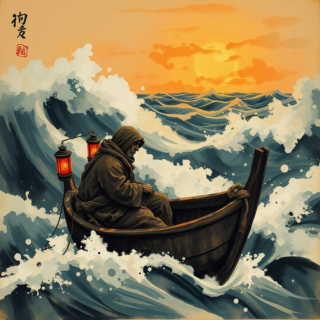 A poignant seascape of a weathered diver in a small boat, set against a turbulent, abstract background reminiscent of sumi-e and Expressionist brushstrokes, with a single, glowing lantern and a melancholic sunset casting a warm, golden light on the chaotic scene.