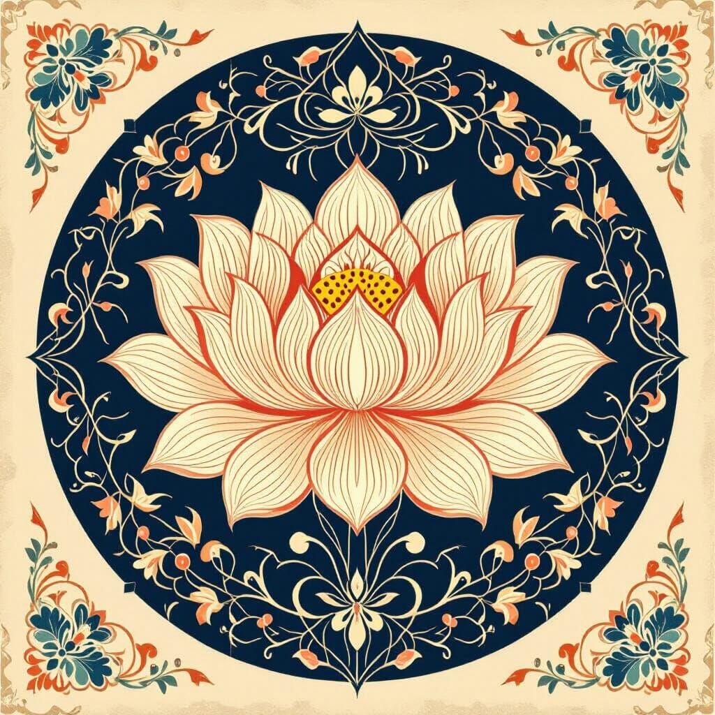 This image showcases vintage Japanese stencil designs with traditional patterns and a lotus motif. The artwork blends Japanese and Korean art styles, featuring delicate linework and soft colors.
