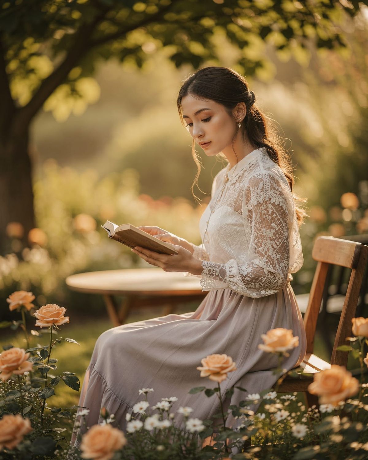 A young woman in a delicate lace blouse sits reading a book amidst a sun-dappled garden of orange roses and white flowers.