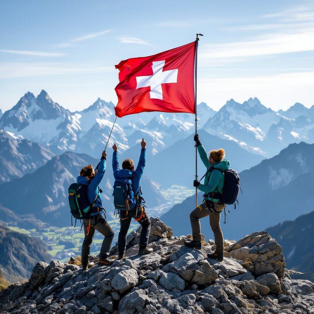 This image depicts mountaineers raising a flag in a moment of triumph atop snowy peaks, with a majestic view of the Swiss and Bavarian Alps.