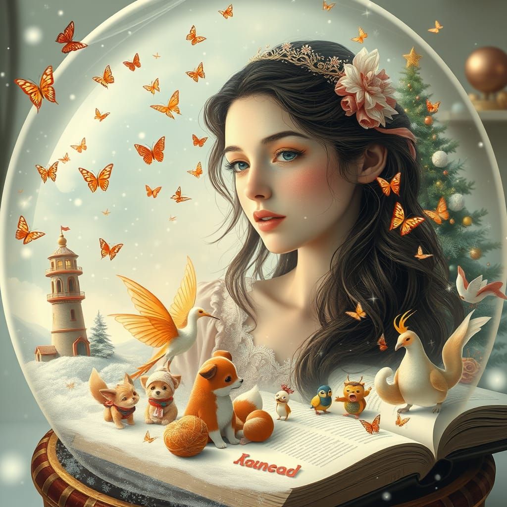 This enchanting scene features an ethereal young woman amidst a whimsical snowglobe world, complete with a miniature lighthouse, playful animals, and a swirling vortex of butterflies and birds, all captured in a delicate double exposure effect.