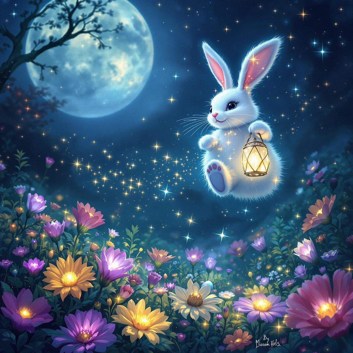 This enchanting image shows the Easter Bunny floating above a vibrant, glowing flower bed, surrounded by a trail of sparkling stardust and carrying a delicate crystal lantern. The scene is dreamy and full of wonder, capturing the magic of the Easter season.