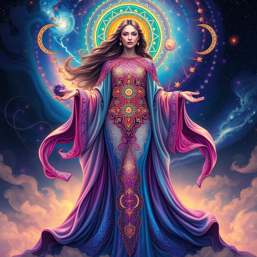 This image shows a psychedelic woman in an iridescent robe, radiating vivid colors. The artwork, set against cosmic nebulae, features mandala patterns and soft, ethereal glows in a visionary art style.