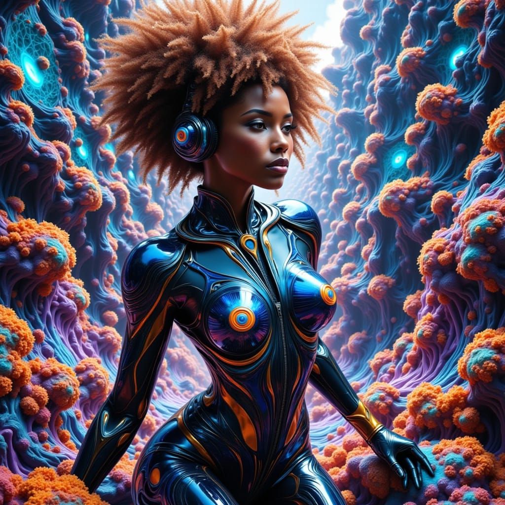 This image is a stunning portrait of a futuristic African woman in a beautiful, intricate body suit, set against a vibrant, fantastical cityscape with deep colors and detailed fractal patterns, creating a captivating and alluring visual experience.