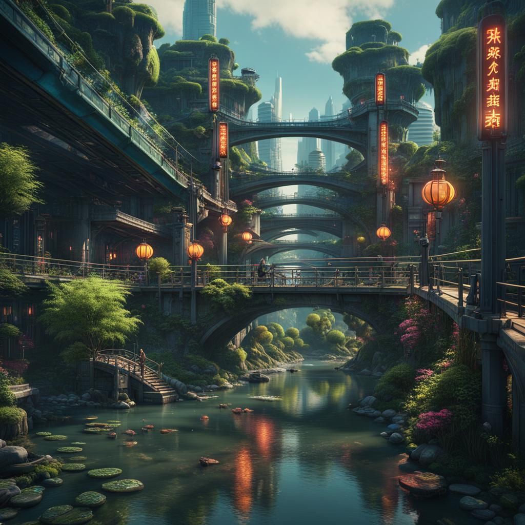 This image shows a futuristic oriental city blending nature with advanced technology. The detailed matte painting features waterways, bridges, and retro science fiction elements in complementary colors, creating a utopian scene as concept art.